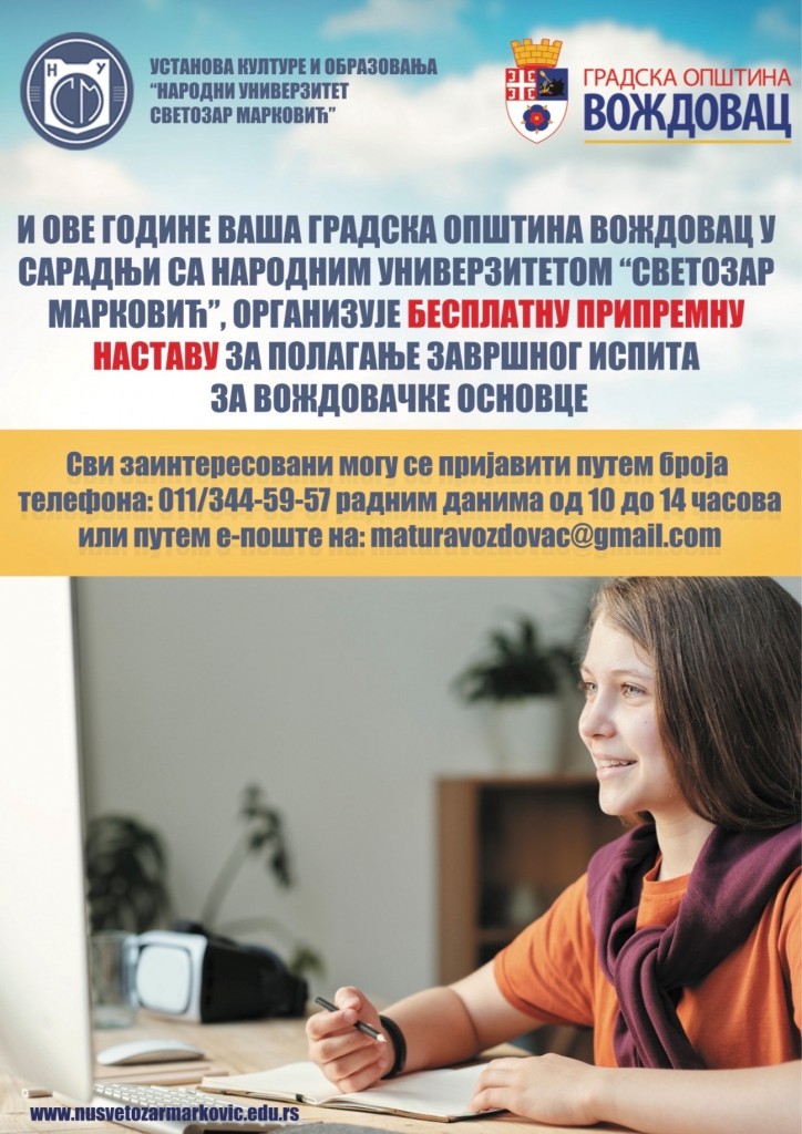 Gradska opština Voždovac i Ustanova kulture i obrazovanja „Narodni univerzitet Svetozar Marković“ pozivaju učenike završnih razreda osnovnih škola da se prijave na besplatne časove pripreme za polaganje završnog ispita. Svi zainteresovani se mogu prijaviti slanjem imejla na: maturavozdovac@gmail.com i telefonom 011/344-59-57, radnim danima od 10:00 do 14:00 časova.