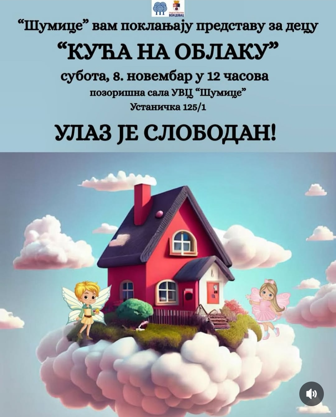Pozorište „Šumice“ sa zadovoljstvom vas poziva na dečju predstavu „Kuća na Oblaku“, koja će se održati u subotu, 8. novembra u 12 časova. Predstava će se izvesti u sali UVČ „Šumice“ na adresi Ustanicka 125/1.
