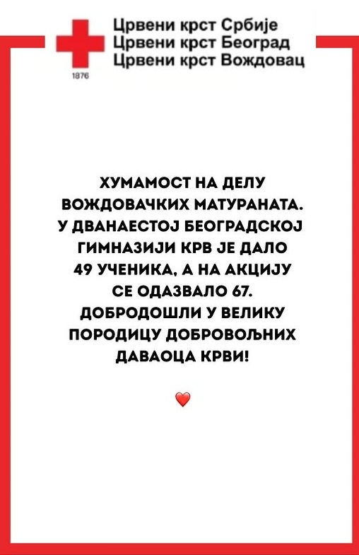 Humanost mladih na Voždovcu još jednom je došla do izražaja. U akciji dobrovoljnog davanja krvi, održanoj u Dvanaestoj beogradskoj gimnaziji, učestvovalo je čak 67 maturanata, dok je njih 49 uspešno dalo krv.