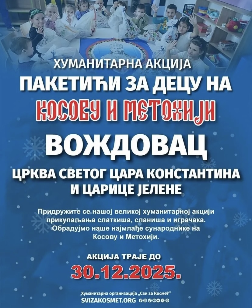 Na Voždovcu je pokrenuta velika humanitarna akcija prikupljanja paketića za decu na Kosovu i Metohiji, koju organizuje Crkva Svetog cara Konstantina i carice Jelene u saradnji sa humanitarnom organizacijom „Svi za Kosmet”. Cilj akcije je da se najmlađim sunarodnicima obezbede slatkiši, slaniši, igračke i paketići koji će im ulepšati predstojeće praznike.