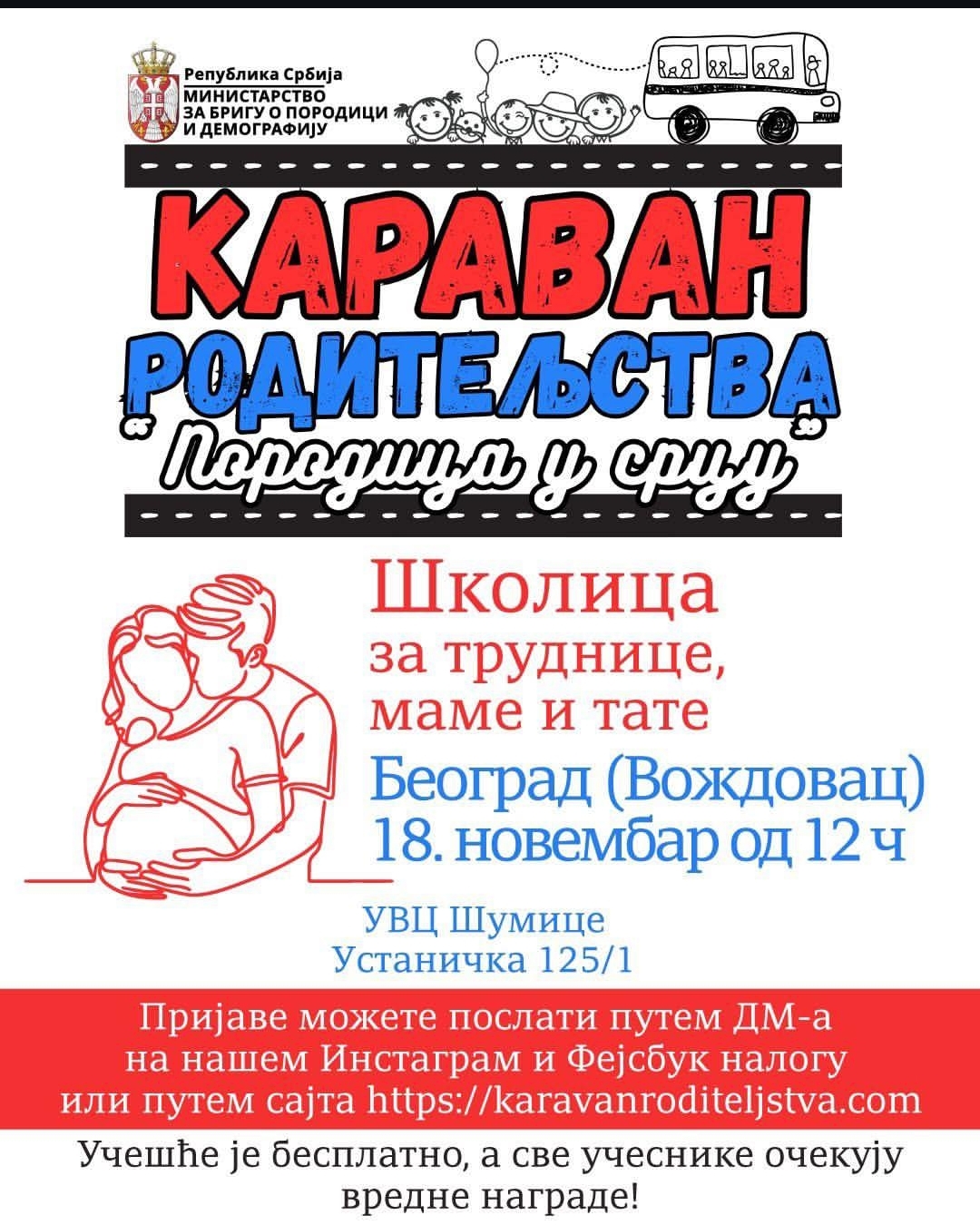 Karavan roditeljstva pod nazivom “Porodica u srcu“ Ministarstva za brigu o porodici i demografiju Republike Srbije, biće održan u utorak, 18. novembra, u prostorijama UVČ „Šumice“ (Svečana sala), Ustanička 125/1.