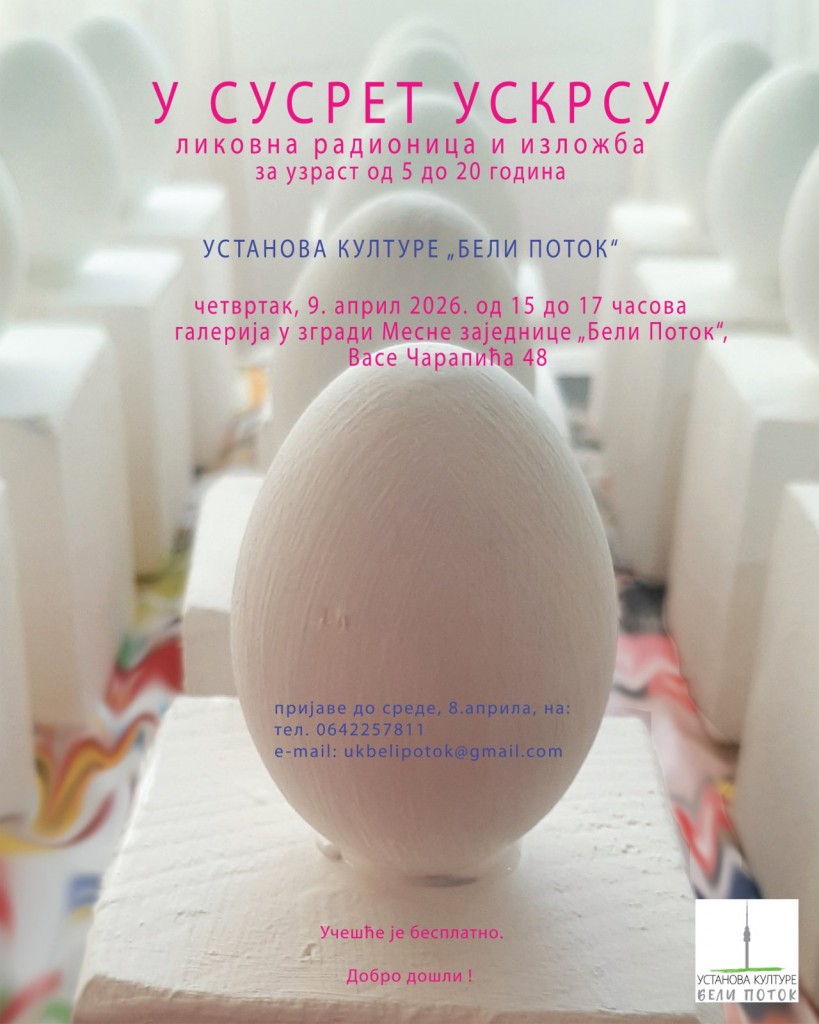 Povodom velikog hrišćanskog praznika Uskrsa, u Mesnoj zajednici „Beli Potok“ (Vase Čarapića 48) u četvrtak, 9. aprila, biće organizovana likovna radionica i izložba namenjena mladima.