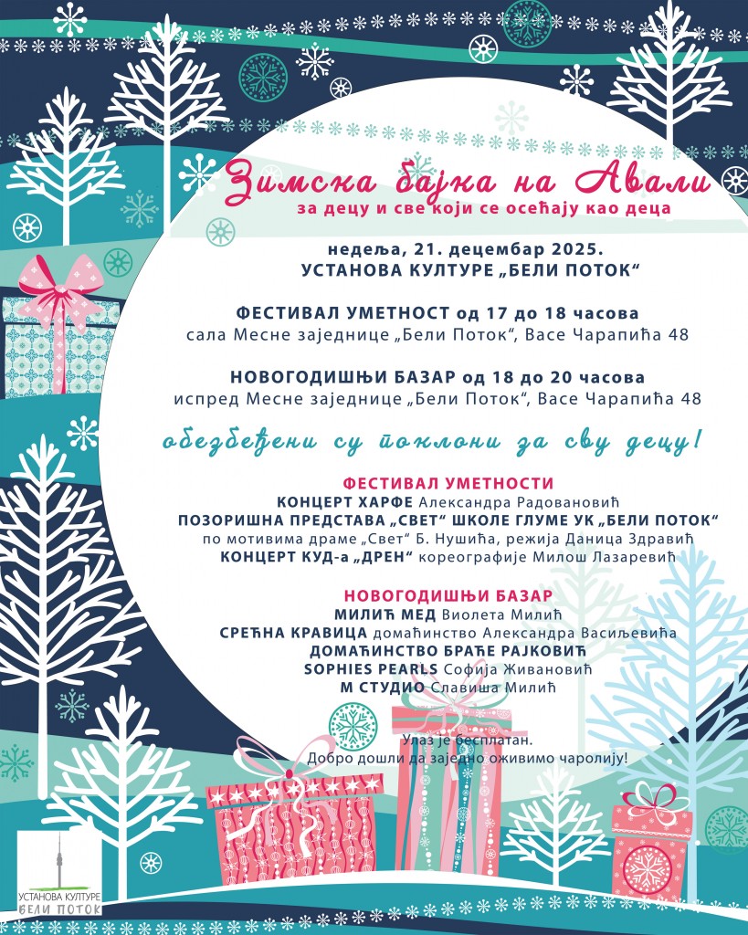 Povodom predstojećih praznika Ustanova kulture „Beli Potok“ tradicionalno organizuje događaj ZIMSKA BAJKA NA AVALI za decu i sve koji se osećaju kao deca, u nedelju 21. decembra 2025. godine.